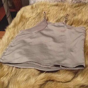 Crafted from a smooth, satin-like fabric in a grey color. It features a high neckline and thin spaghetti straps, typical of the minimalist 90s/Y2K aesthetic.