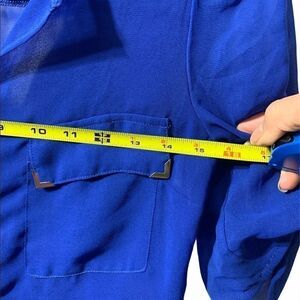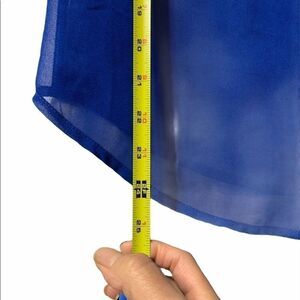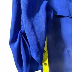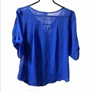 Dynamite royal blue sheer blouse in amazing used condition. Has silver embellishments on pockets and sliver buttons in front for detailing. Sleeve can be lowered for a longer length. The material is 100% polyester is sheer and light.
