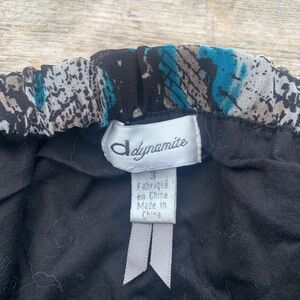 Fierce and stylish Dynamite mini skirt featuring a bold snakeskin print in shades of black, grey, and teal. This high-waisted skirt has a flattering layered silhouette and stretchy waistband for a comfy fit. Perfect for a night out or styled casually with a crop top and sneakers.