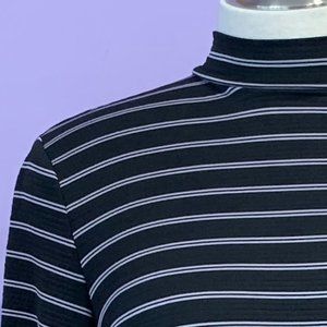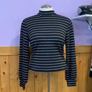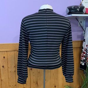 Dynamite striped long sleeve mock neck top, size XL. Balloon sleeves with extended stretchy cuffs. Zipper closure on back. Black with mauve stripes.