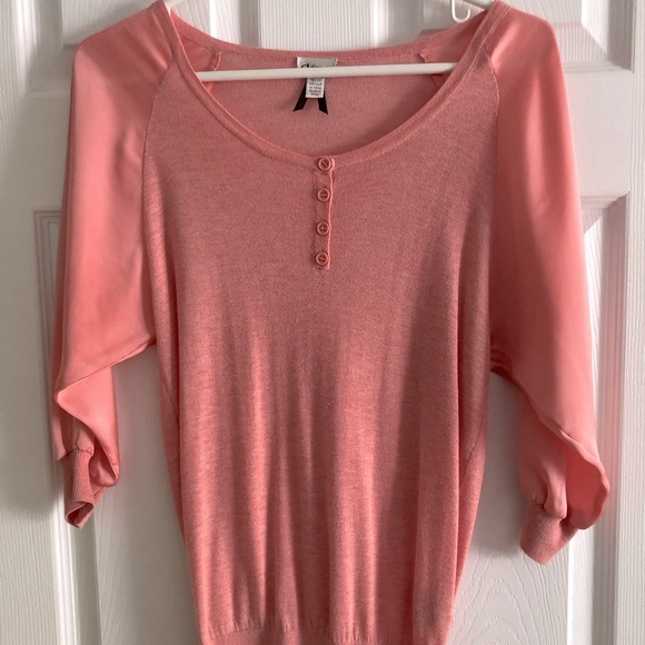 Dynamite sweater with knit body and satin sleeves. Excellent condition except for a couple subtle imperfections in the sleeves.