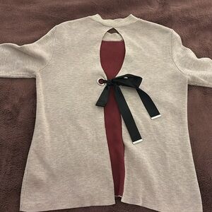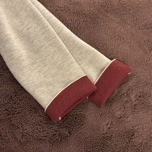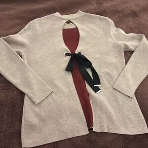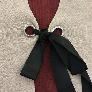 oatmeal & burgundy - the most gorgeous sweater breaks my heart it’s too small! satin tie back with silver grommets, burgundy inside, sleeves can be capped to feature the red interior. a small amount of pilling around arms that could be shaved, other than that the shape of the sweater has held up beautifully.
