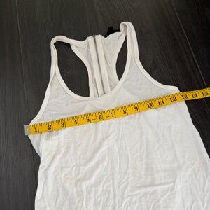 Sleek and versatile white tank top. Features a racerback design. Ideal for layering or wearing alone.