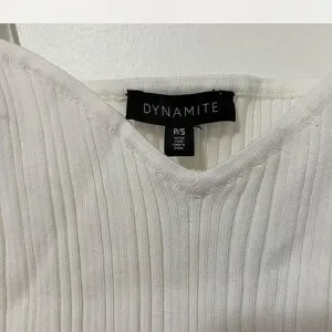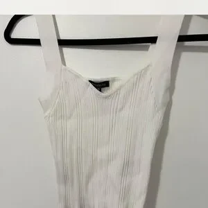 Stretchy ribbed knit body. Subtle V-neck with thick straps. Flattering, body-skimming silhouette. Versatile piece for casual or dressed-up looks.