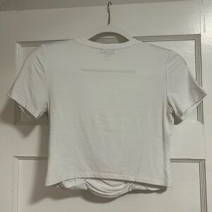 Stylish white crop top with ruched detailing. Ideal for casual wear.