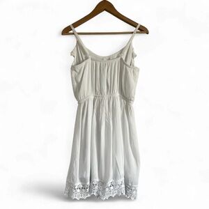 Chic white mini dress with ruffle detail. Features delicate lace hem. Perfect for summer outings.
