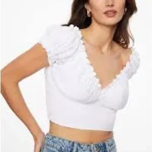 Chic white crop top with ruffled neckline. Perfect for casual outings.