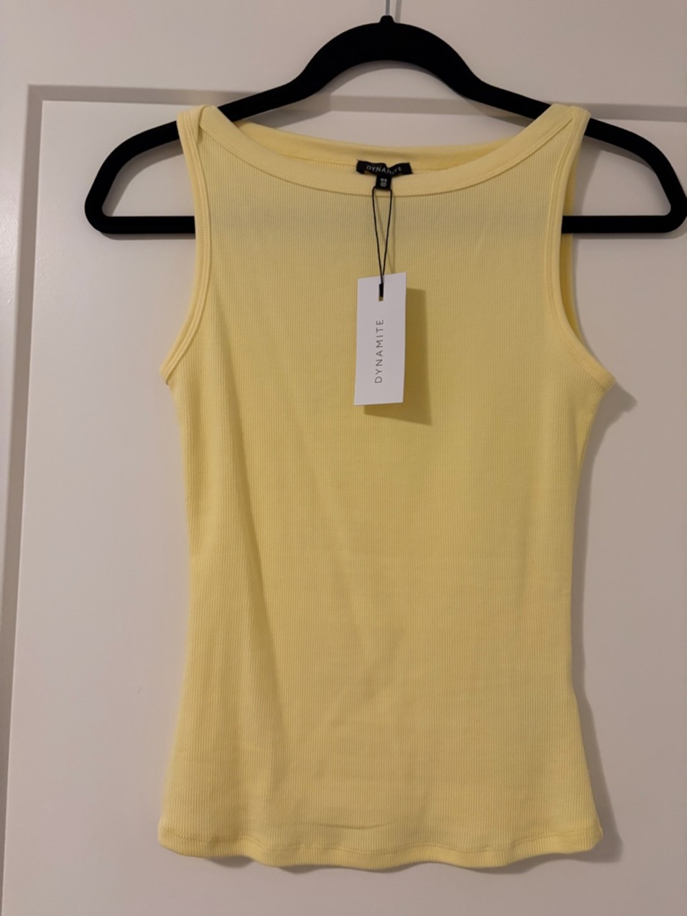 Dynamite sleeveless ribbed tank in a soft yellow hue. Lightweight, stretchy fabric for comfortable all-day wear. Clean, versatile design that pairs easily with jeans or skirts. A bright, sunny staple for seasonal wardrobes.