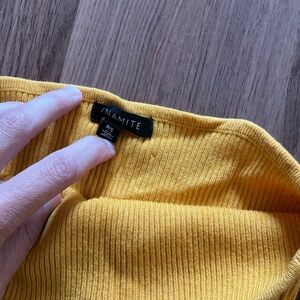 Mustard yellow ribbed tube top. It’s more mustard in real life than in the photos. Wrinkled from being in storage