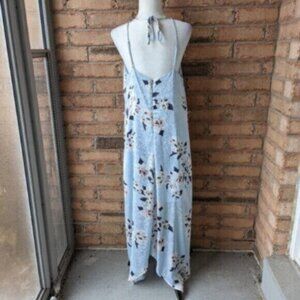 in excellent used condition zips in the back and ties at the base of the neck adjustable straps has loops for a tiny belt (belt not included) flat measurements bust armpit to armpit: 18.5" waist: 19" hips: 24.5" (of under lining) total length (as straps are adjustable, taken from top of neck to lowest part of bottom): 52" V