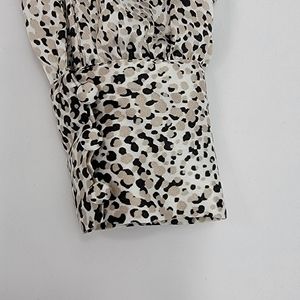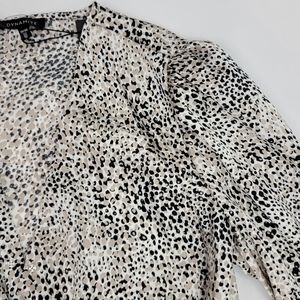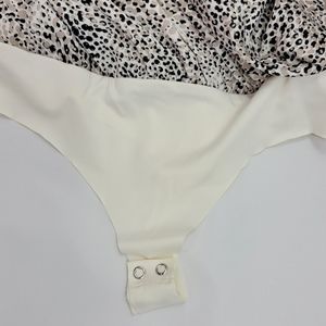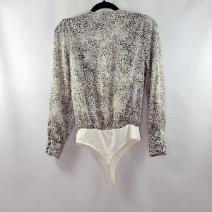 Dynamite Bodysuit leopard print bodysuit criss crosses slightly at chest, long sleeve, thong, snap buttons.