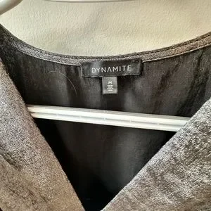 This Dynamite top is a classic. Beautiful but not over the top look. Waist measures 14, top to bottom is 27 inches. Material is polyester. Two sets of snaps at the bottom for best fit, or don’t use them at all. A nice piece for girls night out, office or Christmas party.