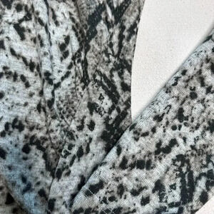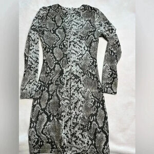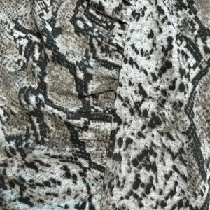 Snakeskin pattern. Soft sweater material, very stretchy. Mid thigh length. Slight ruching on side shown in pic. Machine washable. I’ve always wash on cold and always hung to dry.