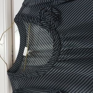 black and grey striped medium sheer dynamite top. Elastic waist and pretty flower detail on the neckline
