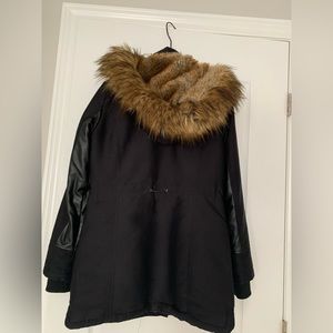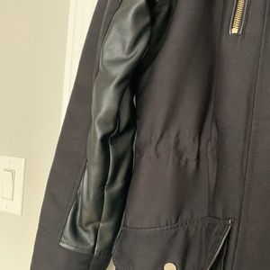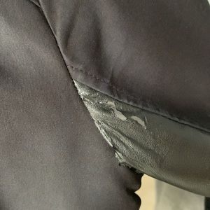 XS dynamite winter jacket . Inside sleeve is synthetic leather. The leather is slightly tearing near the arm out area as per our photo.