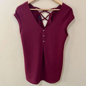 Dynamite|Pretty Wine Short Sleeve Top Blouse Woven Back Front Metal Accents Sz S