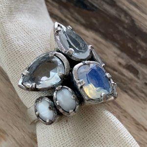-Milky white centre stone, surrounded by clear crystals and white cat's eye glass cabouchons