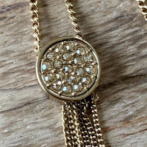 This lovely necklace has champagne gold Swarovski crystals on a round pendant, with tiny, delicate chains dangling below. It's just beautiful in person! Matching bracelet called Skyla, as well as Elidia and Kami earrings are also available in my closet.