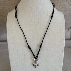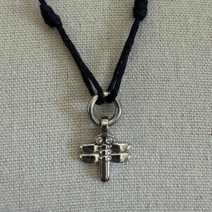 This adorable small dragonfly necklace adjusts in length by pulling on the textile cord.