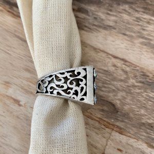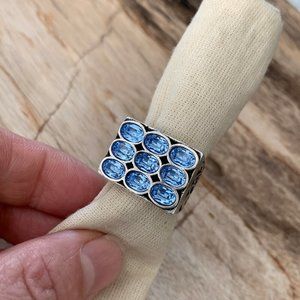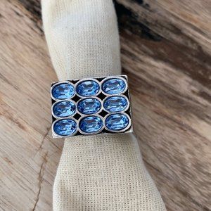 This gorgeous ring in a stunning shade of watery blue features a wide, tapered band with filigree metalwork. 9 beautiful oval Swarovski crystals.