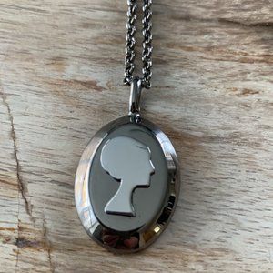 This lovely necklace has a cameo design with a gunmetal oval and shiny silver figure. Chain measures approximately 30 1/2"" long.