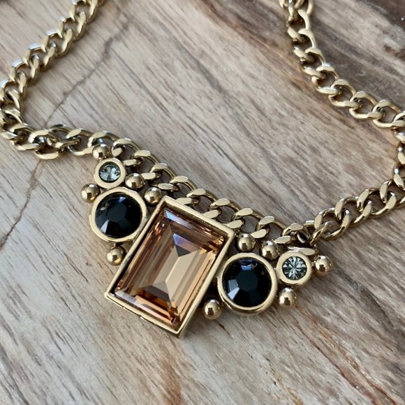 Stunning golden step-cut Swarovski crystal flanked by black and grey Xilion Chaton cut Swarovski crystals all on a smooth curb chain. Gold coloured ion plating, containing a fraction of 24K gold, over solid brass (the best method in the jewellery business, typically used only in watch making).