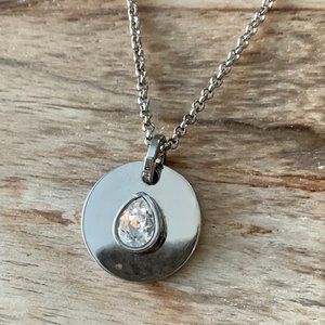 Lovely necklace with pear-shaped clear Swarovski crystal set on a round disc. Shiny silver ion plating (the best method in the jewellery business) over solid brass for strength.
