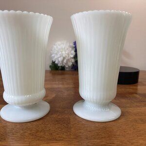 E O Brody Milk Glass Vases Pair Ribbed White Pedestal Planter Vintage Floral Dec