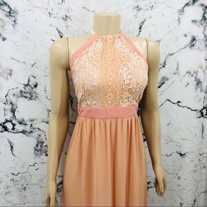 Anthropologie Champagne & Strawberry Backless Halter Layered Maxi Lace Overlay Dress