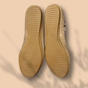 easy spirit e360, size 8 casual flats. Very comfortable memory foam and gel cushioning light sole, with a stretchy foot hugging upper. Attractive gold and taupe tropical leaf pattern. Just like new have only worn a few times indoors just to try on.