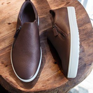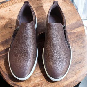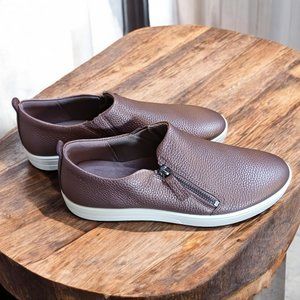 Elevate your casual style with ECCO Women's Fara Slip-On Sneakers in a stunning metallic copper tone. These low-top sneakers feature a convenient side zipper, durable outsole, and cushioned leather interior for all-day comfort. Store display, never worn (NWOT) in excellent condition, though without the box. Perfect for effortless wear and lasting durability, these sneakers combine chic design with superior comfort. Grab these must-have sneakers today and step out in style!