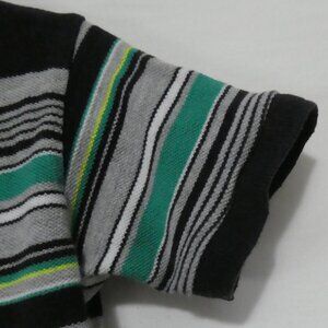 This stylish polo shirt features a classic striped pattern in black, grey, and green hues, perfect for casual outings