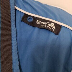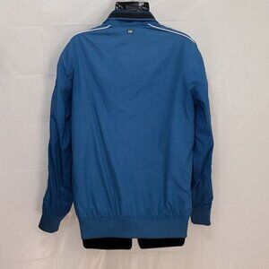 Item is in great used condition with only a couple of minor flaws: There is a tiny tear on the back of the jacket. It is shown in a closeup picture and the name is written on the tag (it can be blotted out). Material is 100% polyester. The measurements are in the last picture and are approximations.