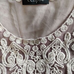Beautiful sleeveless top with intricate lace detailing. Features a delicate pink hue with white lace accents.