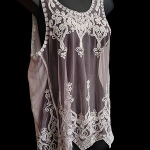Beautiful sleeveless top with intricate lace detailing. Features a delicate pink hue with white lace accents.
