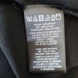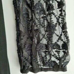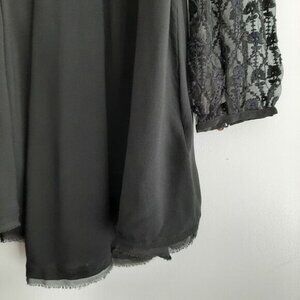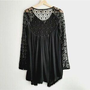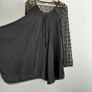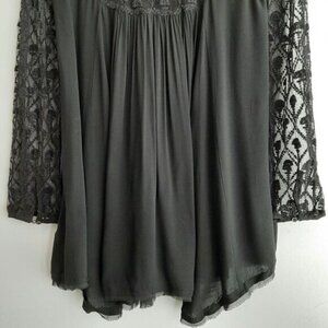 • Long sleeve scoop neck pullover tunic top in black with sheer flower lace sleeves, shoulders and back yoke.
