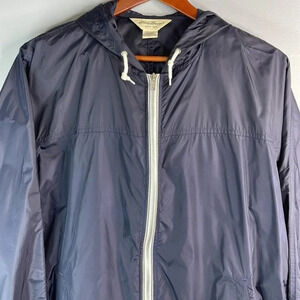 Ladies navy blue Eddie Bauer lightweight oversized hooded drawstring waist windbreaker jacket. Contrast white zipper and strings.