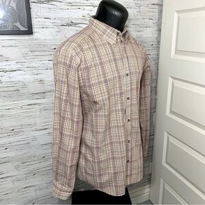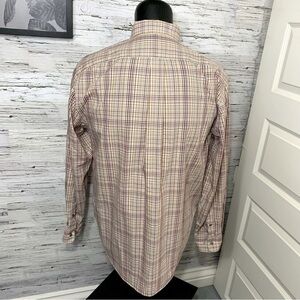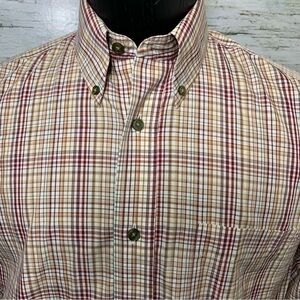In excellent condition, well made and quality breathable 100% cotton shirt. Nice plaid earth tone colors. 1 chest pocket, back pleat for a relaxed fit wrinkle resistant. 3 buttons on sleeves. Lightweight material. Please see pictures