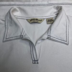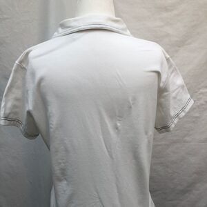 Short Sleeve Open Neck Shirt with White with Navy trim. Size Medium, excellent condition, gently used twice. Fabric is a bit stretchy which is great with 5% Spandex and 95% cotton.