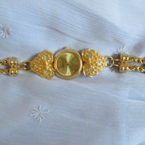 Pretty Edison Quartz movement, round face with metal bezel, gold tone hearts with rhinestones and chain link type strap. Very classy and elegant.