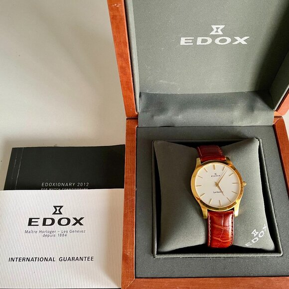 NOTE: No scratches whatsoever on the watch face. The two box hinges (where the box closes and opens) are broken, but this is easily repairable. I'm also reaching out to Edox (in Switzerland) to find out if they can replace the box.