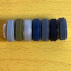 Egnaro Silicone rings 7 pack. New never worn they did not fit me so I'm selling them. They are a size 6 as can be seen in the photos. Each one is a different colour light grey, dark grey, silver, blue, green, black, marbled grey. You can wear a different ring everyday of the week.