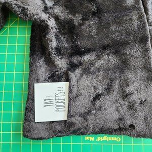 Fabric is jet black, silky smooth, a bit glossy (which makes the pictures look lighter than it is in real life) and has lots of stretch. There is almost a sealskin look to the fabric. It came with black silk covered snaps that unfortunately almost immediately started to loosen and fall off. Brand name label came unstitched on one side.