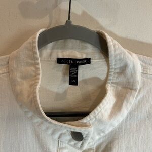 EILEEN FISHER Sz L Shirt Jacket Silver Toned Buttons Patch Pockets Unlined. 100% organic cotton. Dress up or down. Some wear on some of the buttons. Not visible when wearing. Perfect for layering. Vacation. Cruise.