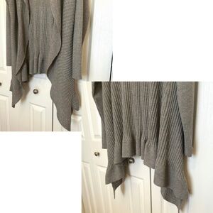 Sustainable Eileen Fisher makes beautiful clothes for living life! This open front, diagonal rib with crepe knit ruffle edge cardigan is made from 100% Wool Italian Yarn that is lightweight and washable. Longer at the front edges for drape and interest. Long sleeve. This fine knit sweater literally floats across the seasons with its breathable fabric. Size is XL. Approx flat measurements: Chest 25”, Waist24”, Hip29”, Sleeve 24.25”, Shoulder 20.5”, Length 28.5” around sides and back, 36” at the front corners.