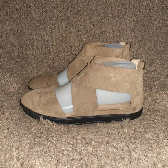 EILEEN FISHER-Light Brown Suede Platform Sandals-Back Zip-Sz 7.5-Near Mint