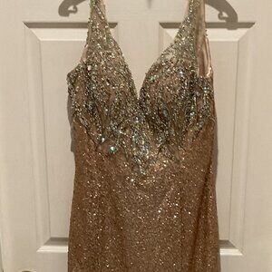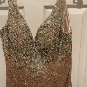 Gown is sequined and adorned with beads and rhinestones - front and back - with a 27" side split -fully lined