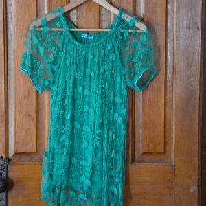 Short sleeved green sheer with floral pattern over a solid green tank style top.
