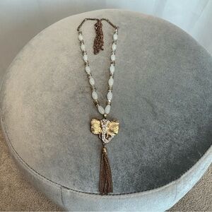 ELEPHANT hammered gold-tone crystal rhinestone dangling chain beaded necklace