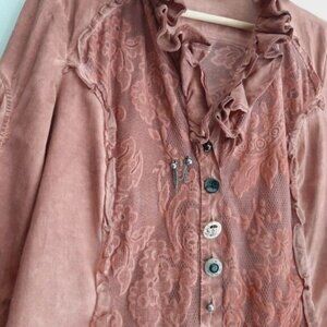 • Long sleeve button down burnout style top in rusty red with ruffle collar and floral lace panels. Made in Italy.